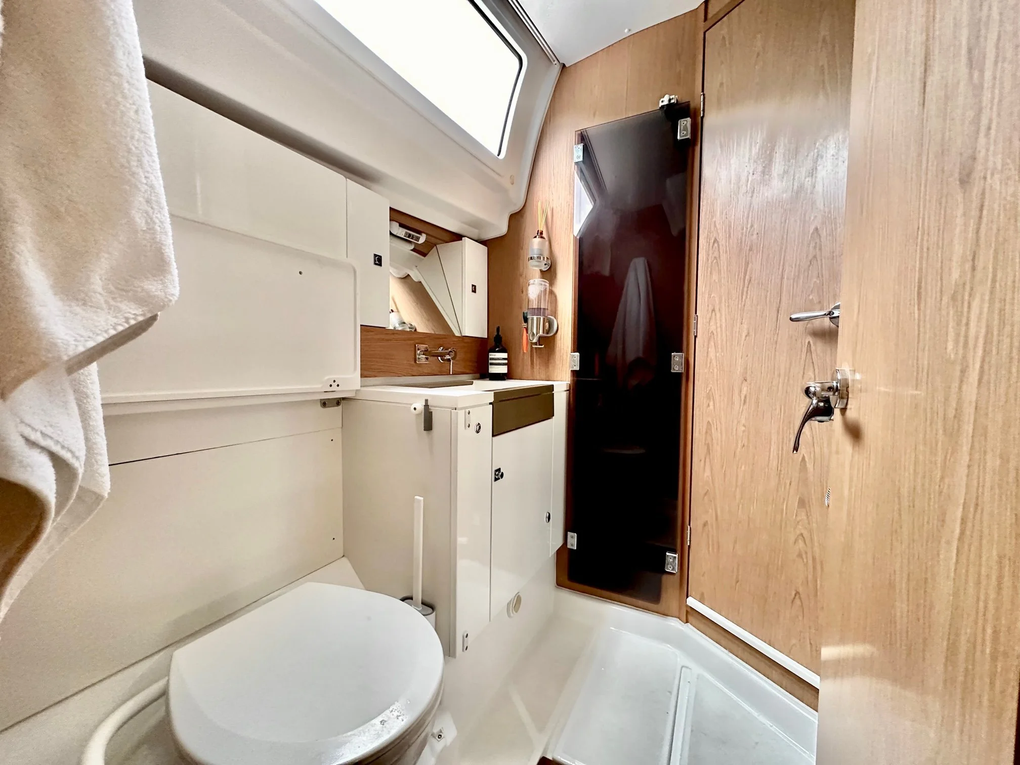 Upper Left is bright and cheery with windows offering panoramic views! It brings all the creature comforts you're used to on land to the water! Comfy beds, private heads (bathroom) & showers, a fully equipped galley (kitchen), and plenty of seating. Oh, Kyler’s favorite feature is the outdoor deck shower!